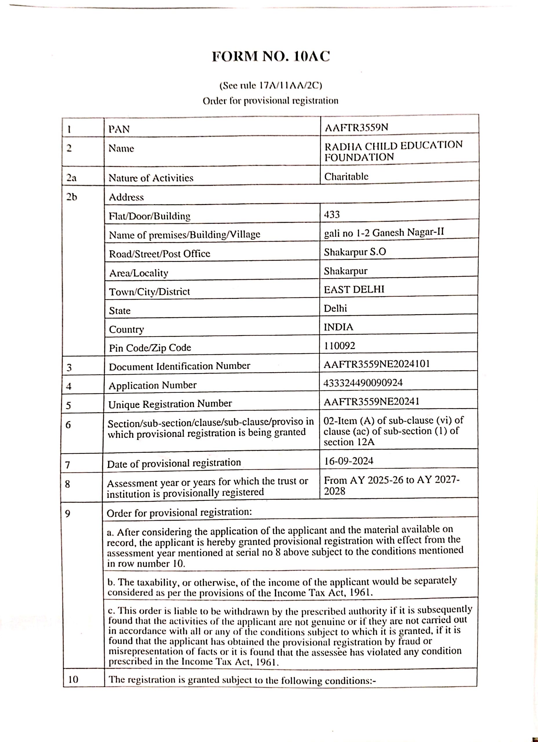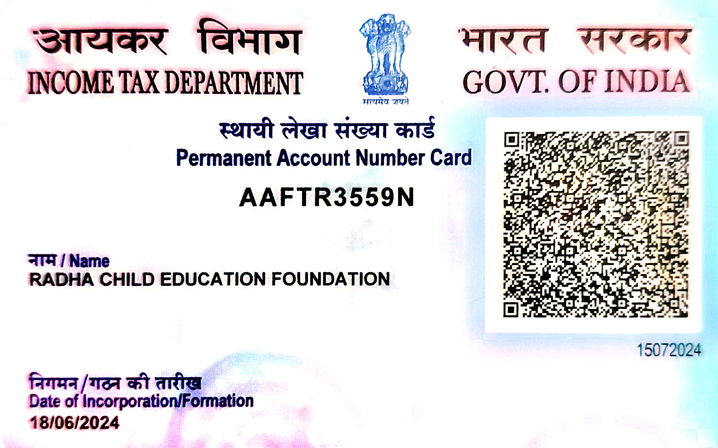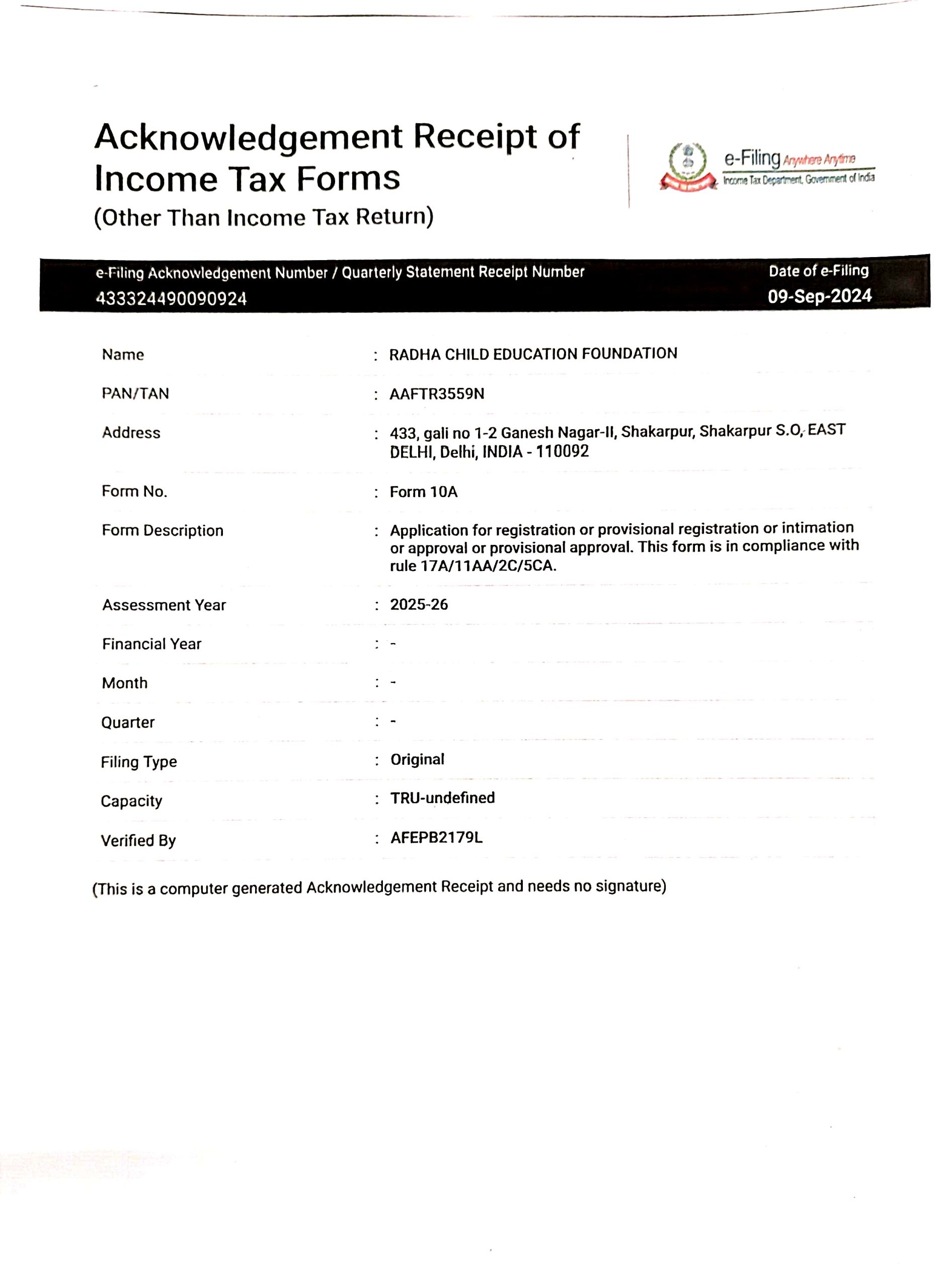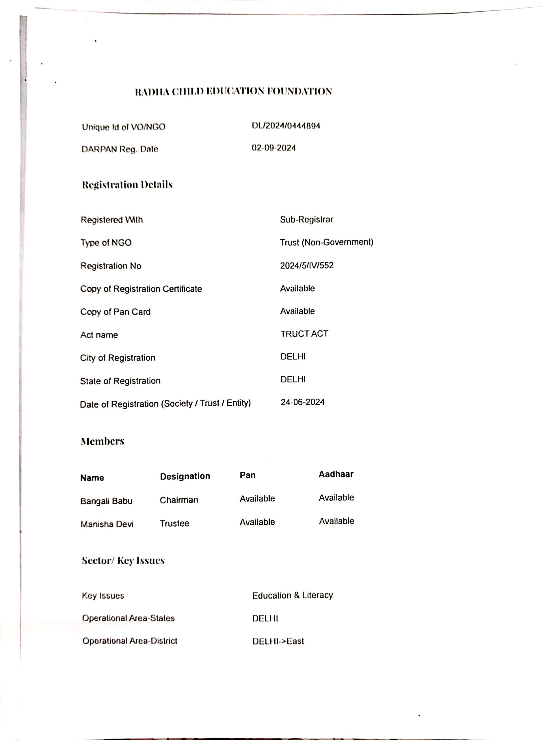 Document GalleryRadha Child Education Foundation 12A Registration E-ANUDAAN NGO Darpan ITR Return PAN Card
